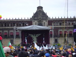 Luego, el escenario, el templete. Un águila juarista, en cuyas patas lleva una serpiente y más abajo un nopal (en lugar de flechas y olivos, fuera de esa diferencia son muy pareciditas la del norte y la del sur, no me vengan con mamadas) estaba en el fondo, enorme, con aires de grandeza (y aires verdaderamente gélidos). Sillas de madera labrada con piel color vino esperaban al mentado “gabinete” de Andrés Manuel (¡yo quiero una! Se ve que eran nuevas y mandadas a hacer exprofeso) estaban flanqueadas por 2 banderotas (estas si, con el escudo oficial mexicano), y al frente, con uns barrotitos de madera (muy al estilo de los estrados que aparecen en los juzgados de películas gringas) el púlpito desde el que se leerían discuros y se moverían masas.